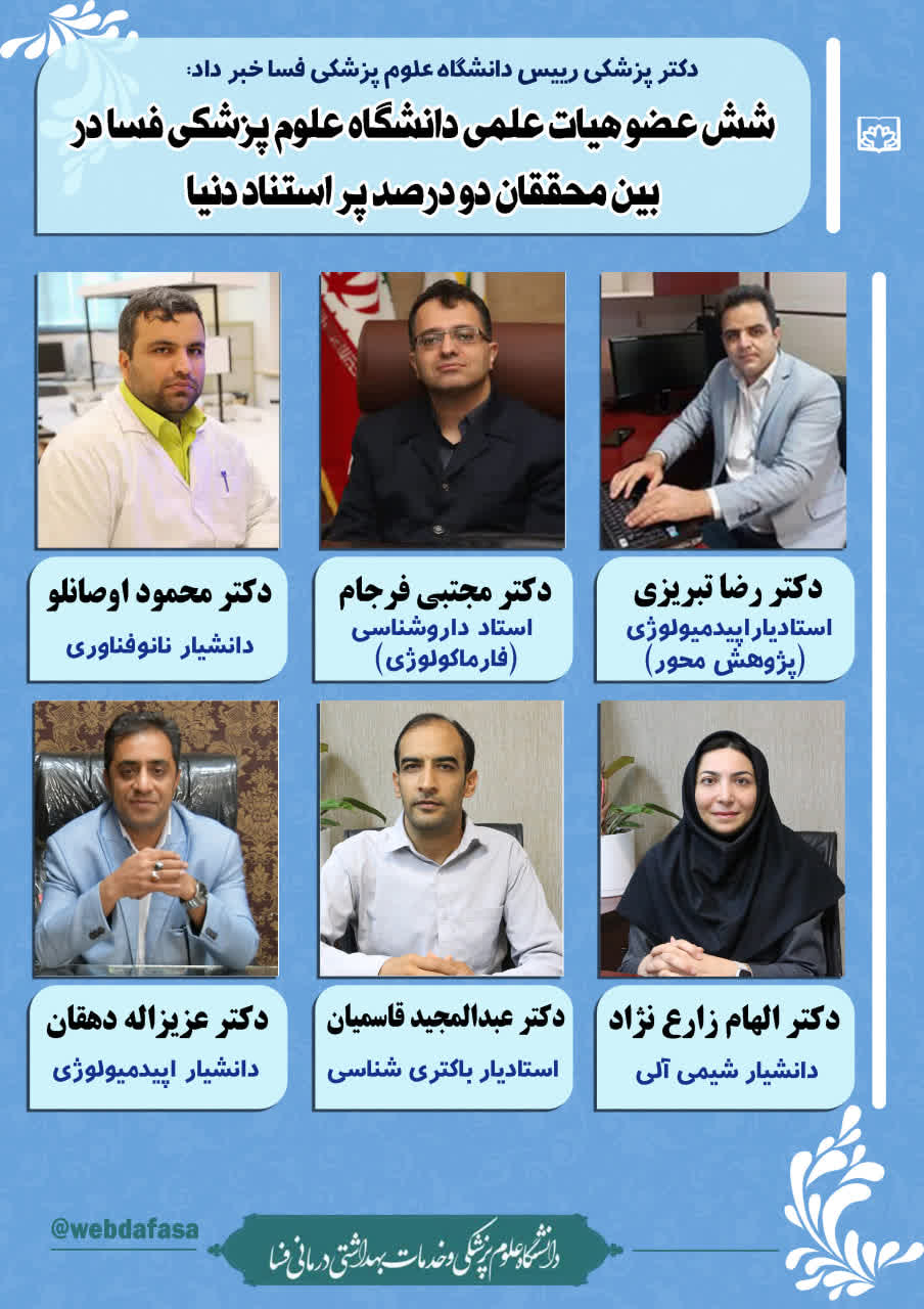 رییس دانشگاه علوم پزشکی فسا گفت: با انتشار فهرست دانشمندان جهان به عنوان دو درصد پر استناد جهان در سال2025، شش عضو هیات علمی دانشگاه در بین محققان دو درصد پر استناد دنیا معرفی شدند.